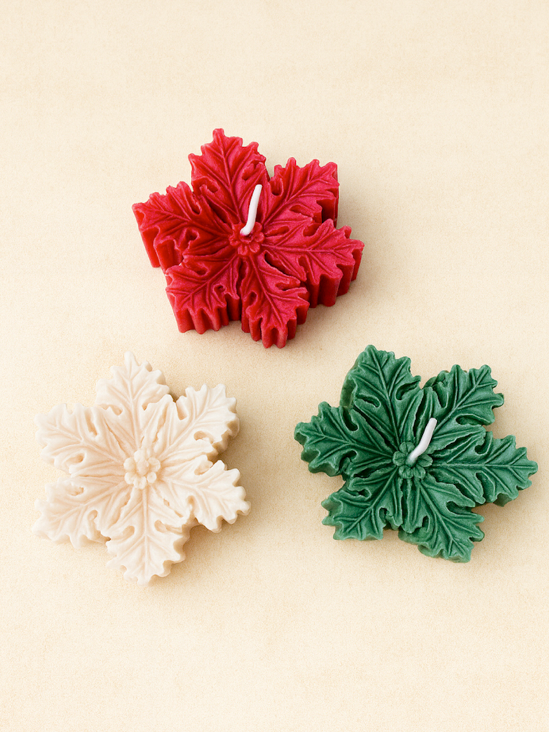 Cada vela presenta un diseño detallado en forma de copo de nieve, con relieves finos que aportan textura y un acabado artesanal.